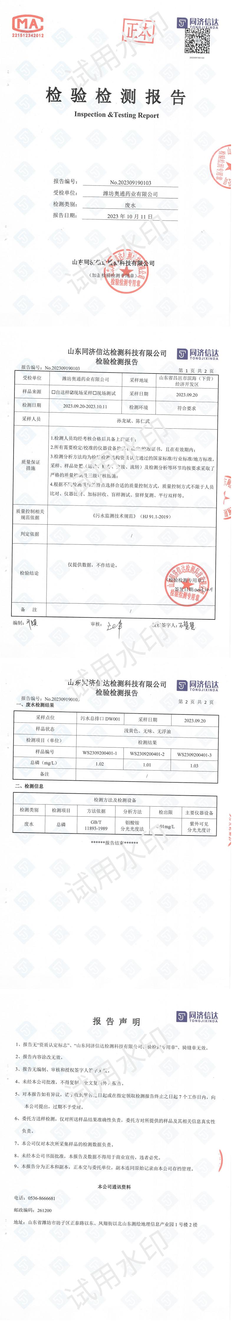 濰坊奧通藥業(yè)有限公司九月環(huán)境檢測報告