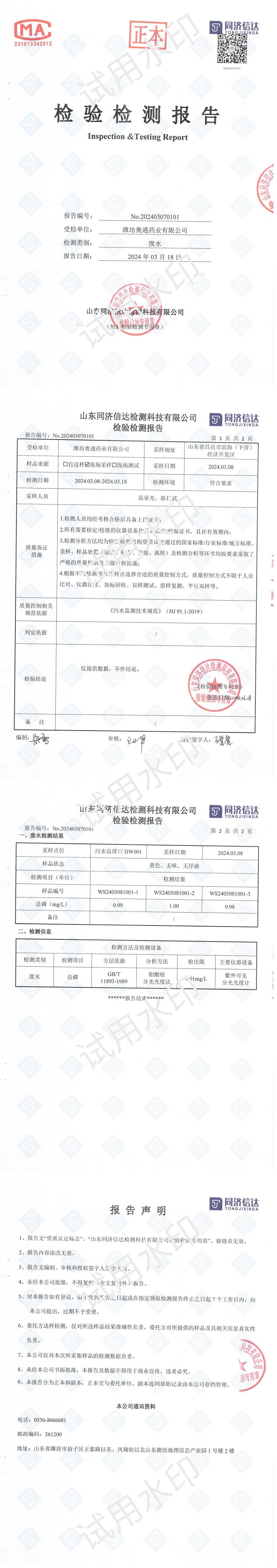 濰坊奧通藥業(yè)有限公司三月環(huán)境檢測報(bào)告