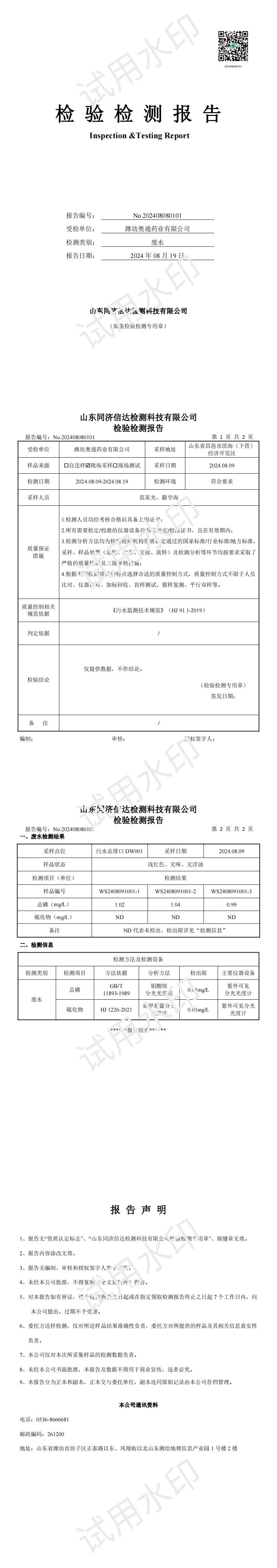 濰坊奧通藥業(yè)有限公司八月環(huán)境檢測報(bào)告